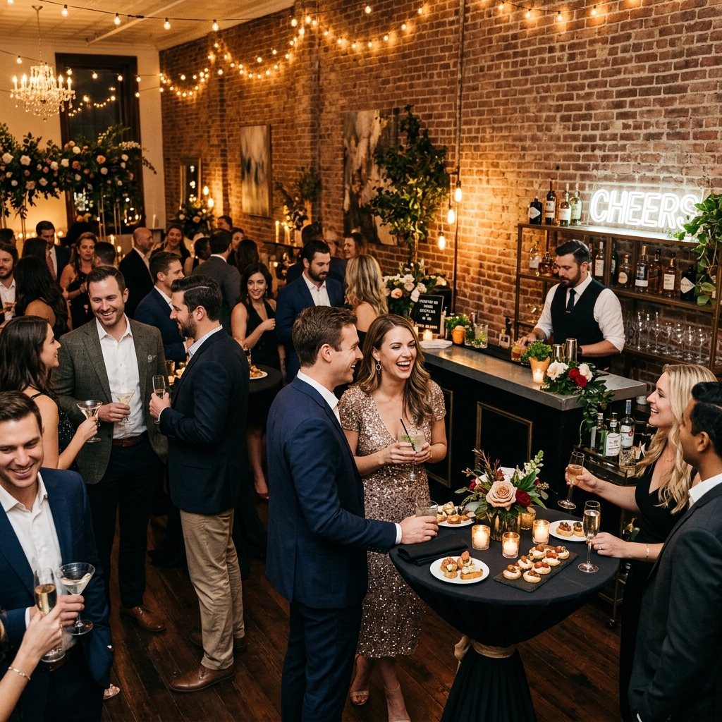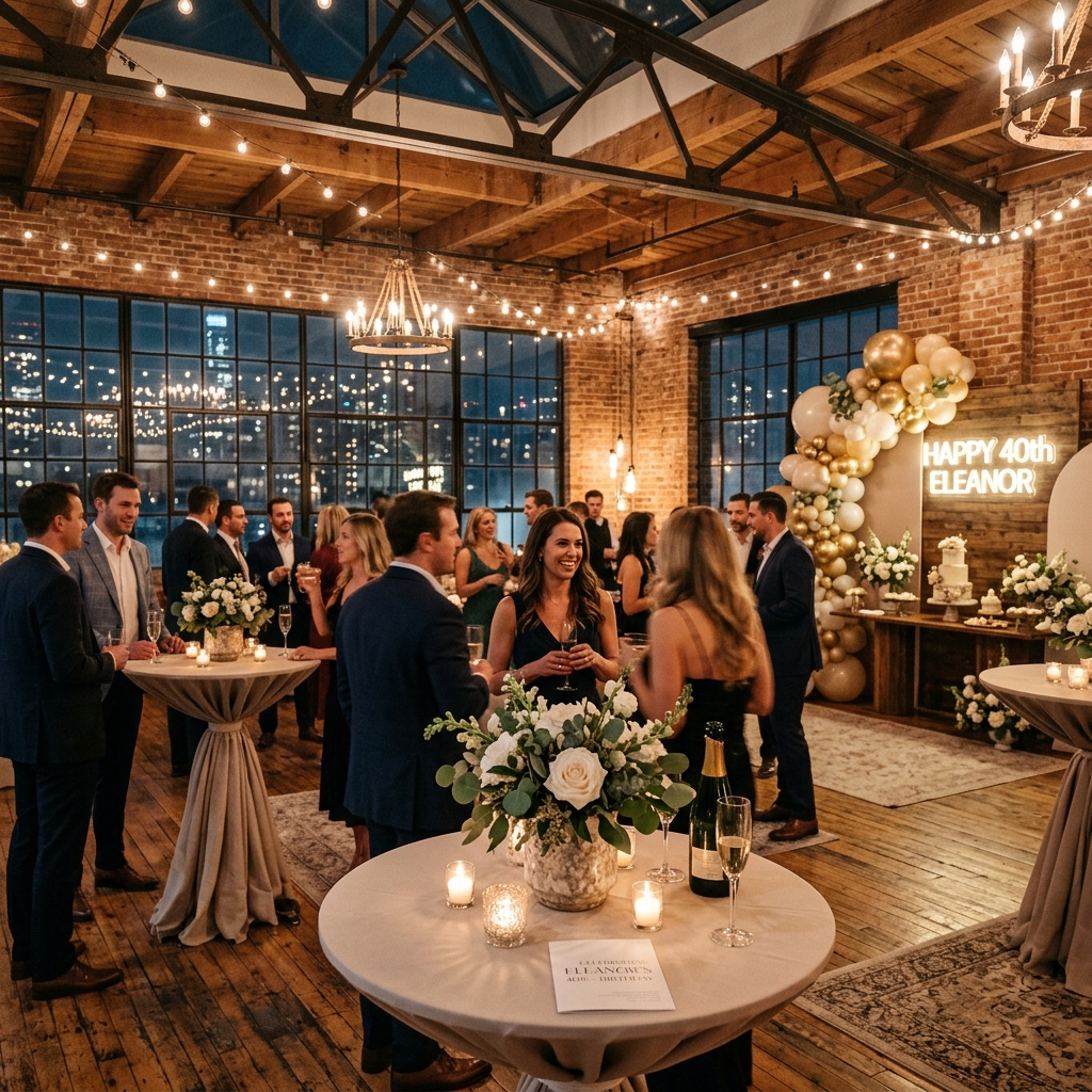 Our NYC loft venue is completely private when you book with us — this is entirely your space, your night, your story. The exposed brick walls, LED lighting, and unique loft create an atmosphere that feels both upscale and deeply personal. We work with you to customize every element of the décor, menu, and timing to reflect what makes your celebration unique.